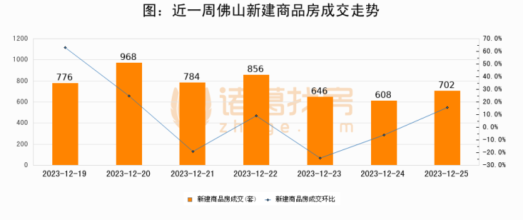 根据佛山市住房保障和房产信息网数据显示,2023年12月25日佛山新建商品房成交702套,较昨日增加94套,环比上涨15.5%