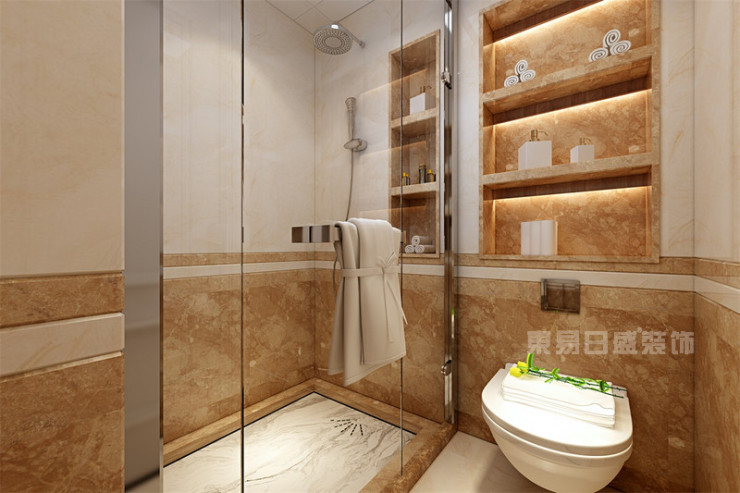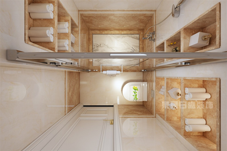 卫生间一定要干净整洁,所以采用白色和棕黄色,洁净却不生硬。俯瞰图,卫生间被玻璃隔断,做到干湿分离,功能划分清楚,在使用时更加便捷。
