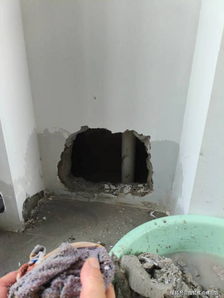 有业主房子主卧飘窗水管破裂,水哗啦啦流出,至今还没找出水管破裂位置,凿开的洞也还没补上。