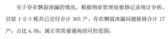 3、关于存在飘窗渗漏情况,根据物业管理处统计,目前1-2-3 栋共已交付合计 365 户,存在飘窗渗漏问题报修合计17户,占比 4.6%,属正常质量通病的可控范围;