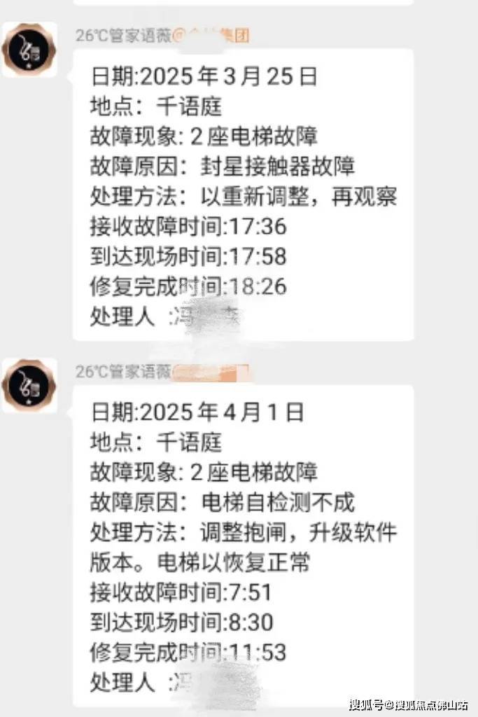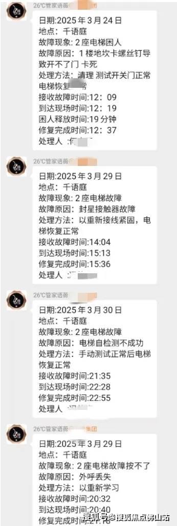 据说收楼以来,电梯发生故障频率非常高,从业主提供的物业发出的电梯故障处理信息看到,一周电梯竟发生了4次事故,对于这个数值,不少业主觉得还是保守了。
