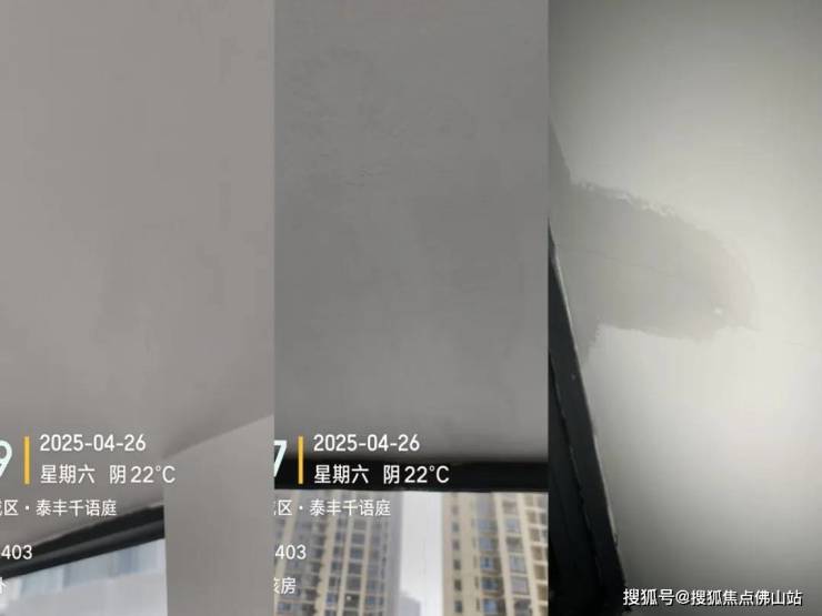 从供图来看,屋内从客厅墙面到阳台、卫生间、卧室飘窗都有出现渗水情况,面积或大或小。