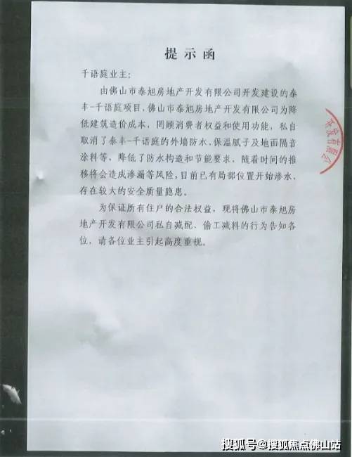 因楼盘质量堪忧,有业主自发在小区内张贴了警示函。