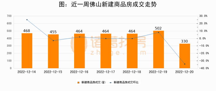 根据佛山市住房保障和房产信息网数据显示,2022年12月20日佛山新建商品房成交330套,较昨日减少172套,环比下降34.3%。近一周佛山新建商品房日均成交450套,其中,12月19日成交量最高为502套。12月20日单日成交330套,低于近一周平均水平26.7%。