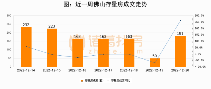 从存量房来看,2022年12月20日佛山存量房单日成交181套,比昨日增加131套,环比上涨262%。从近一周存量房成交来看,佛山存量房日均成交套数为167套,其中12月14日成交量最高为232套,12月20日单日成交181套,高于近一周平均水平8.4%。