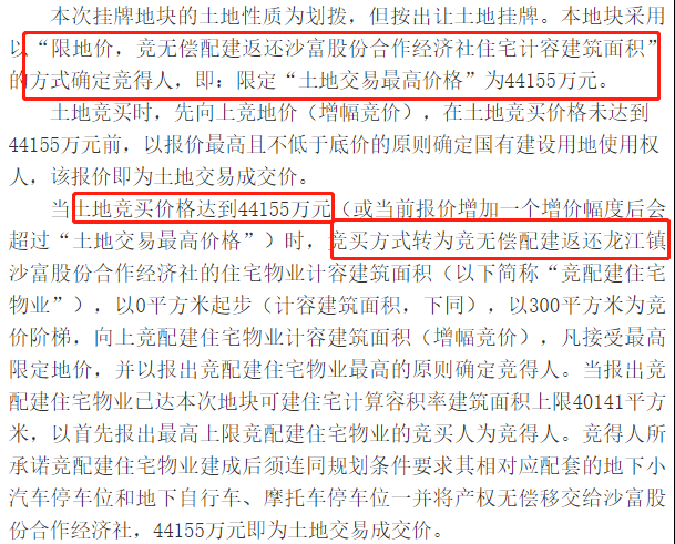 宗地采用“限地价,竞无偿配建返还沙富股份合作经济社住宅计容建筑面积”的方式确定竞得人,限定较高价格为44155万元。