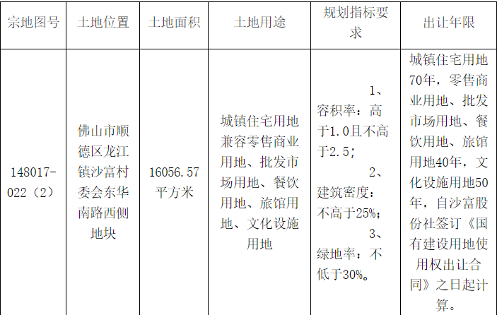 宗地位于顺德区龙江镇沙富村委会东华南路西侧地块,占地16056.57㎡,起拍价22480 万元,于7月13日上午10点网拍。