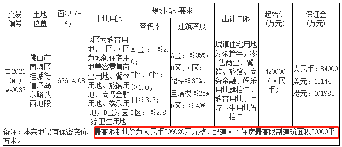 宗地采用“限地价+配建人才住房”方式竞拍,限制较高地价509020万元整,配建人才住房较高限制建筑面积50000平方米。