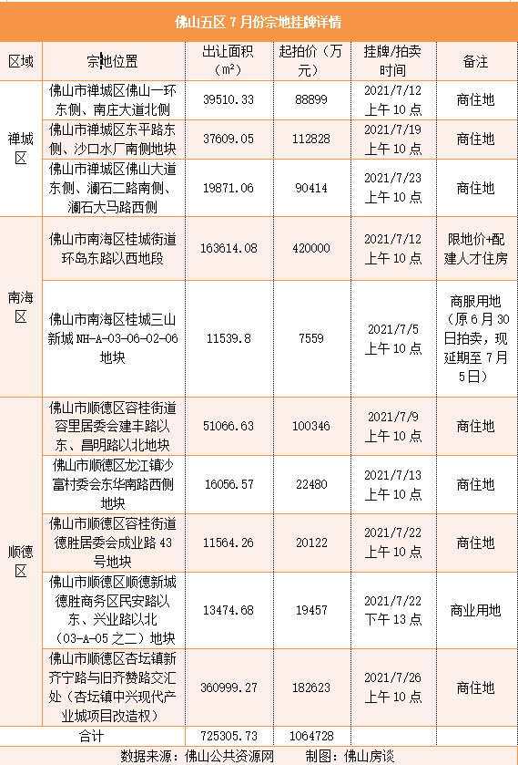 从图表上看,各区域中,禅城3宗,南海2宗,顺德5宗,三水、高明暂无地块挂牌。