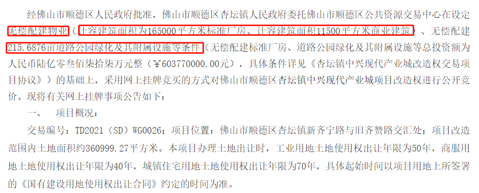 宗地位于顺德区杏坛镇新齐宁路与旧齐赞路交汇处(杏坛镇中兴现代产业城项目改造权),占地360999.27 ㎡,起拍价182623万元,于7月26日上午10点网拍。