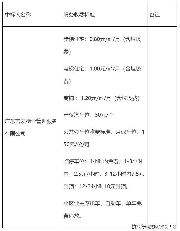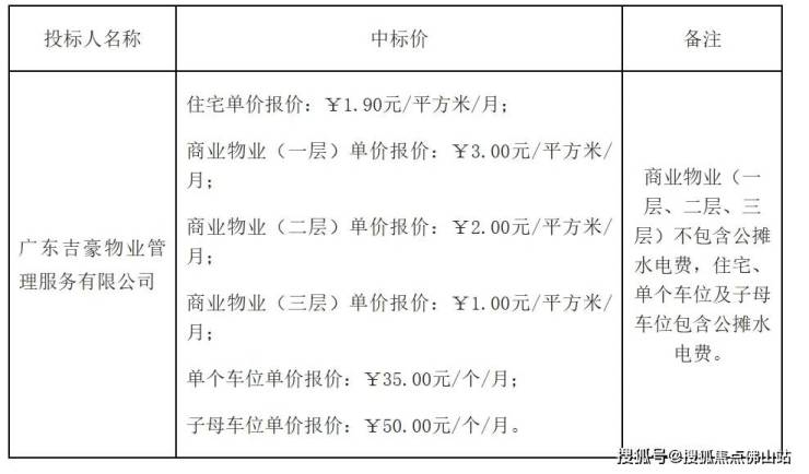 中标人为广东吉豪物业管理服务有限公司,住宅物业费为1.9元/㎡·月,商业根据楼层不同,物业费也不同,1-3元/㎡·月之间,单个车位物业费为35.00元/个·月,子母车位则为50.00元/个·月。