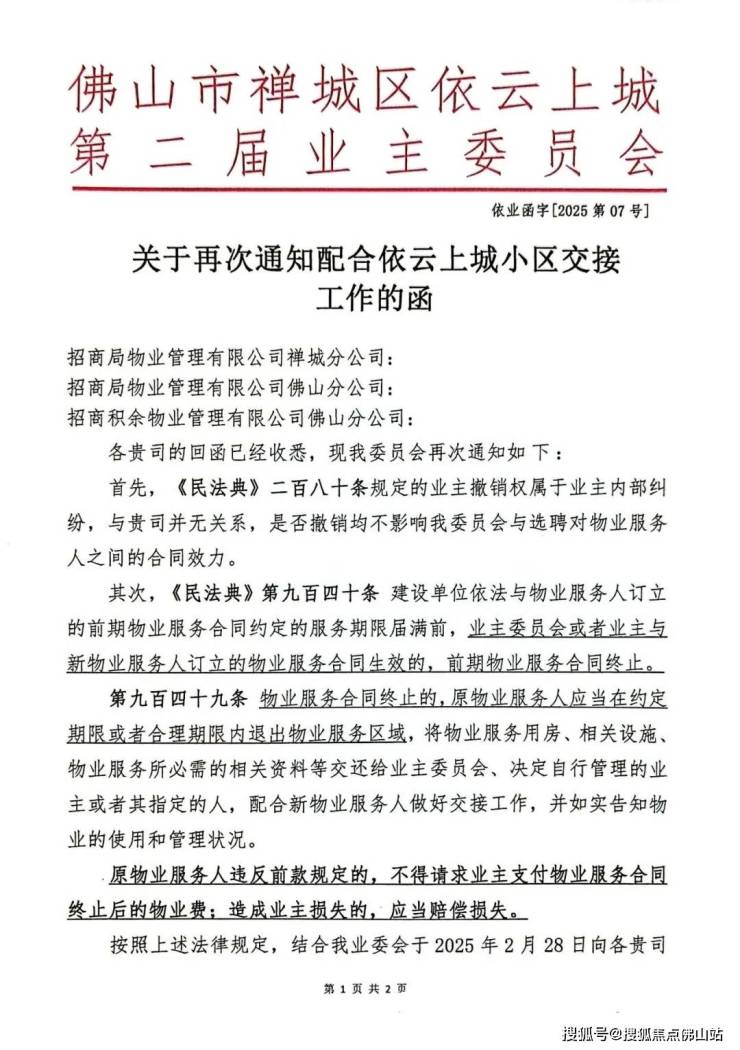 通知显示,业委会于2月28日向招商局物业发出了“退场通知书”,招商物业应当在2025年4月30日24时全面退出依云上城小区,如不退出的将承担相应的违法责任,而新的物业公司则于5月1日正式入驻依云上城。
