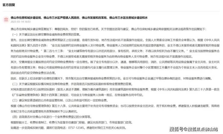 对此,佛山市住房和城乡建设局答复称:“出台长期空置物业减免物业费政策缺乏上位法依据,容易引发纠纷,地方性法规对此不宜直接作出规定。因此,在缺乏上位法依据与合理性的情况下,我市暂无出台空置房屋减免物业费政策的计划。业主可与物业服务企业通过平等自愿协商的途径,对物业服务费进行调整。”