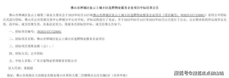佛山市公共资源交易信息化综合平台显示,2月24日,佛山市禅城区依云上城小区选聘物业服务企业项目结果公告出炉。