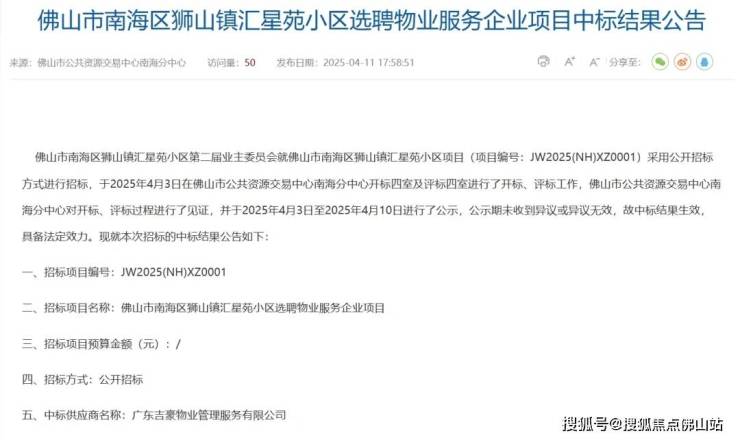 4月11日,佛山市公共资源交易中心南海分中心发布了“狮山镇汇星苑小区选聘物业服务企业项目中标结果公告”。