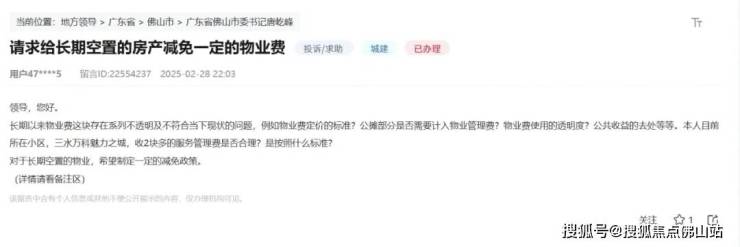 这阵风何时才会吹到佛山呢?日前,有街坊在领导留言板上留言,“请求给长期空置的房产减免一定的物业费”。