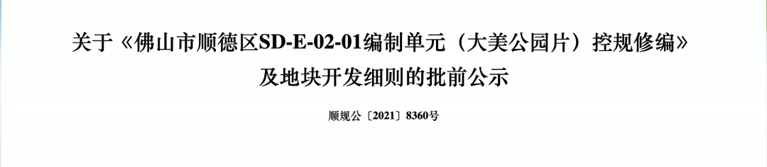 近日,小狐发现佛山市自然资源局顺德分局发布了关于《佛山市顺德区SD-E-02-01编制单元(大美公园片)控规修编》及地块开发细则的批前公示。