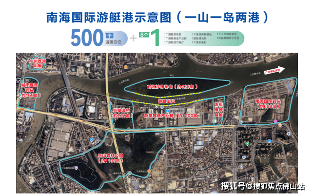 该项目拟利用三山对江沙岸线、原平洲客运港和南港码头的有利条件,打造成一个国际游艇集聚区。