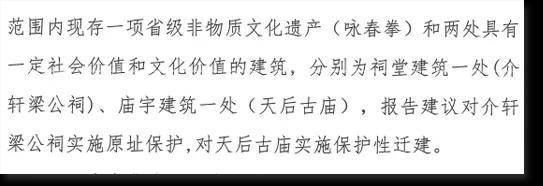 根据《实施方案》,改造范围内有一项省级非物质文化遗产(咏春拳)和两处历史建筑,分别是介轩梁公祠、天后古庙 ,前者将保留原址,后者将迁移重建。