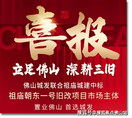 12月17日,佛山城发 发布喜报,宣布联合祖庙城建 中标朝东一号旧改地块市场主体。