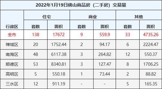 二手住宅成交138套,成交面积17672㎡,其中禅城20套,南海区48套,顺德区53套,高明区5套,三水区12套。
