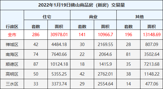 1月19日,佛山一手住宅成交286套,成交面积30978.01㎡