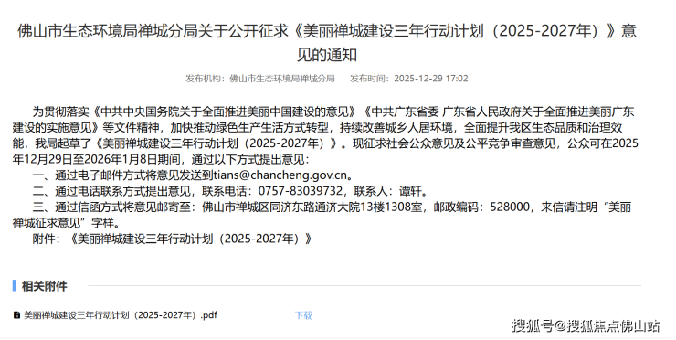近日,佛山市生态环境局禅城分局关于公开征求《美丽禅城建设三年行动计划(2025-2027年)》意见的通知。