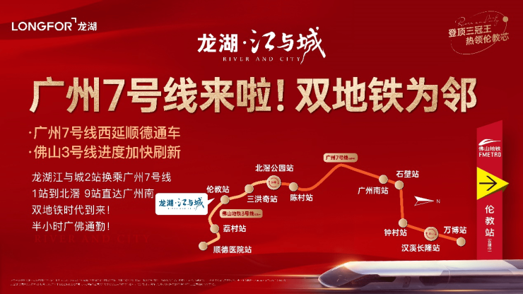 地铁所向,财富所趋!龙湖·江与城紧邻佛山地铁3号线伦教站(在建中),1站北滘,2站换乘广州7号线,9站直达广州南,30min畅达广佛核心城区,尽享双城繁华生活!相较于北滘、番禺等地房价,项目周边乃地铁沿线当之无愧的价格洼地!