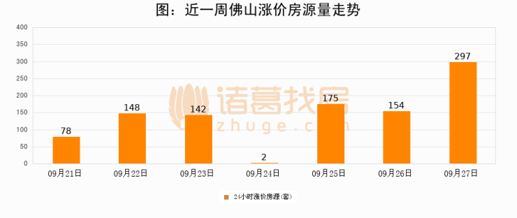 根据诸葛找房数据显示,佛山24小时涨价房源量为297套,较09月26日增加143套,环比上涨92.9%。与此同时,涨价房源占比小幅扩大,业主信心有所提升。