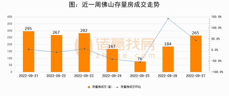 从存量房来看,2022年09月27日佛山存量房单日成交265套,比昨日增加81套,环比上涨44%。从近一周存量房成交来看,佛山存量房日均成交套数为219套,其中09月21日成交量较高为295套,09月27日单日成交265套,高于近一周平均水平21%。