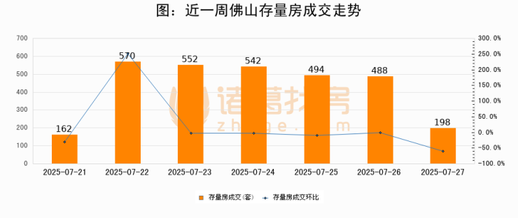 从存量房来看,2025年07月27日佛山存量房单日成交198套,比昨日减少290套,环比下降59.4%。从近一周存量房成交来看,佛山存量房日均成交套数为429套,07月27日单日成交198套,低于近一周平均水平53.8%。