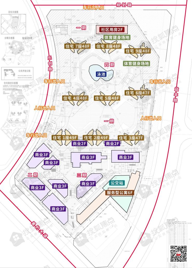 根据公示的规划图可知,项目将分为四期进行建设,其中住宅集中分布在一期和四期,共9栋,较高的1、2座可达49层,3、6座为47层,4、5、7、8、9座皆为48层,总共规划建设住宅2680户。
