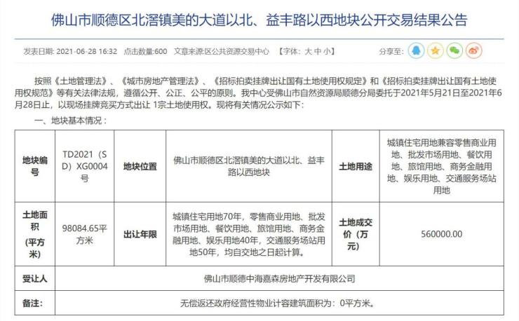 该地块已于今年6月28日完成拍卖,中海最终以总价56亿元、折合楼面价约18843元/平方米的报价力克4家房企竞得北滘新城TOD地块。