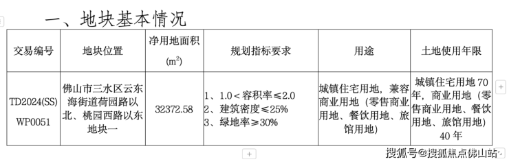 据出让文件,宗地位于云东海街道荷园路以北、桃园西路以东,总占地32372.58㎡,容积率≤2,建筑限高100米,土地用途为城镇住宅用地,兼容商业用地。