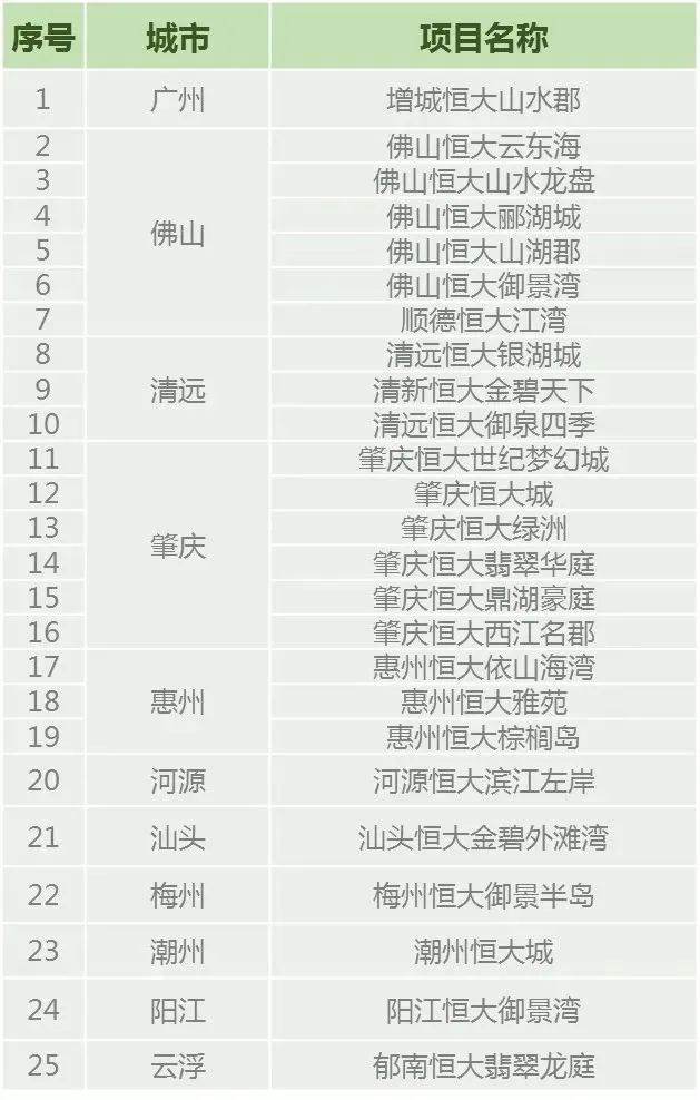 |恒大珠三角现房销售项目一览表 图源恒大地产在珠三角官微