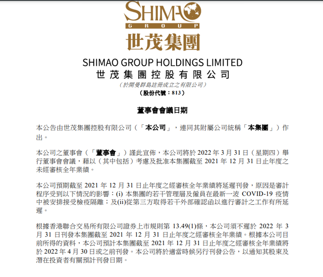 世茂集团在3月21日晚宣布延迟刊发2021年度经审核的全年业绩,原因是公司领导和员工受疫情原因被隔离了,其次是第三方审计工作出现延迟。