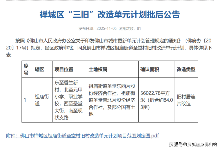 公告显示,按照《佛山市人民政府办公室关于印发佛山市城市更新单元计划管理规定的通知》(佛府办(2020)17号)规定,经区政府审批,同意佛山市禅城区祖庙街道圣堂村旧村改造单元计划。