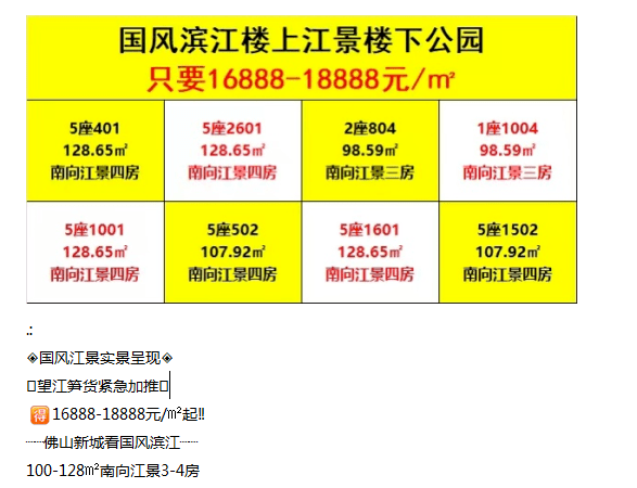 项目属于平洲地段,部分楼栋已经交楼,目前加推95㎡4房单位,均价在2.6-2.8万/㎡之间,日前也有一批号称“真工抵”房流出,价格没太大落差,面积集中在109㎡。