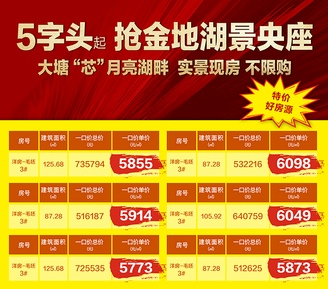 绿岛湖万科金域半岛项目,推出5套87㎡三房特价单位,而且不是天地楼层,02单元总价109万,折合单价1.25万/㎡,05单元则要贵点,总价12x万,单价不超1.45万/㎡。