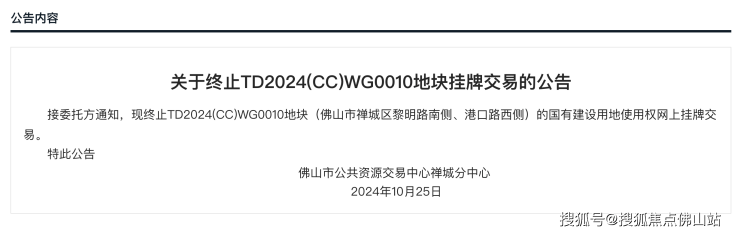 10月25日17时,佛山市公共资源中心发布了有关禅城区黎明路南侧、港口路西侧地块终止挂牌交易的公告。
