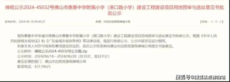 早在今年六月,禅城区自然资源局发布了《现有惠景中学申请办理佛山市惠景中学附属小学(港口路小学)建设工程建设项目用地预审与选址意见书批前公示》。