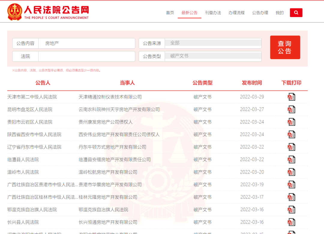 据小编查询人民法院公告网发现,自2022年3月起,全国已经有28家开发商破产倒闭,这意味着平均1天有1家房企走下历史舞台。