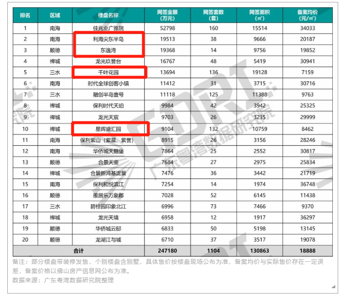 其中,以排在第二位的南海利海尖东半岛为较高,网签38套,网签金额19513万元;第三名的东逸湾网签14套,网签总金额19368万元。
