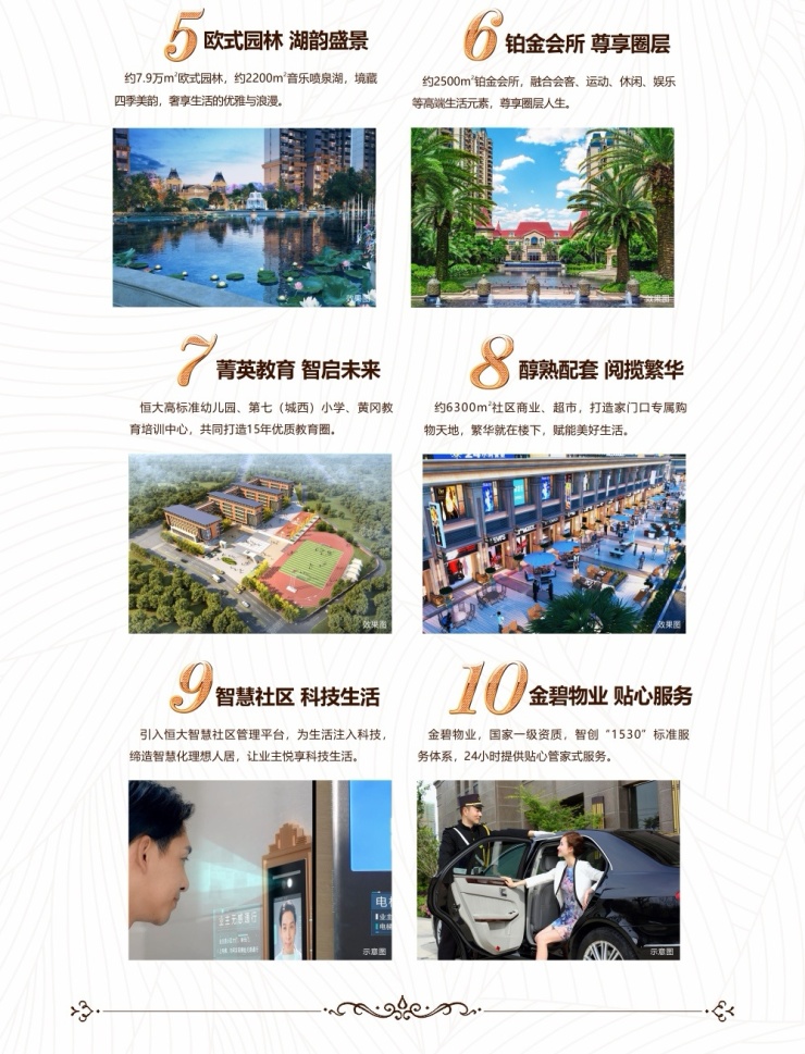 恒大帝景配套 2500 ㎡铂金会所(包含室外游泳池,室内恒温游泳池,健身房,雪茄吧等等)让业主享受 品质生活,1800 ㎡ 6 班幼儿园让业主小孩赢在起跑线上。5100 ㎡商业体能满足业主日常所需。名流云集之地,肇庆人居标杆!