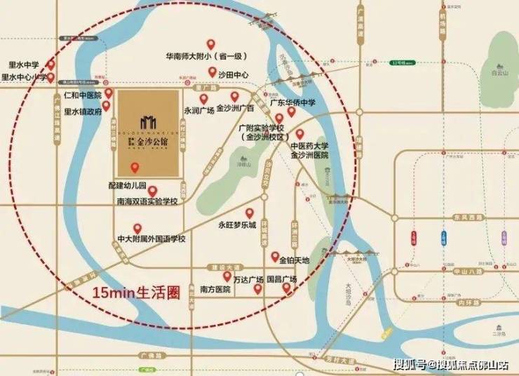 板块空间距离示意图特殊的地理位置,让金沙洲承接广佛两城价值辐射。【周边配套】