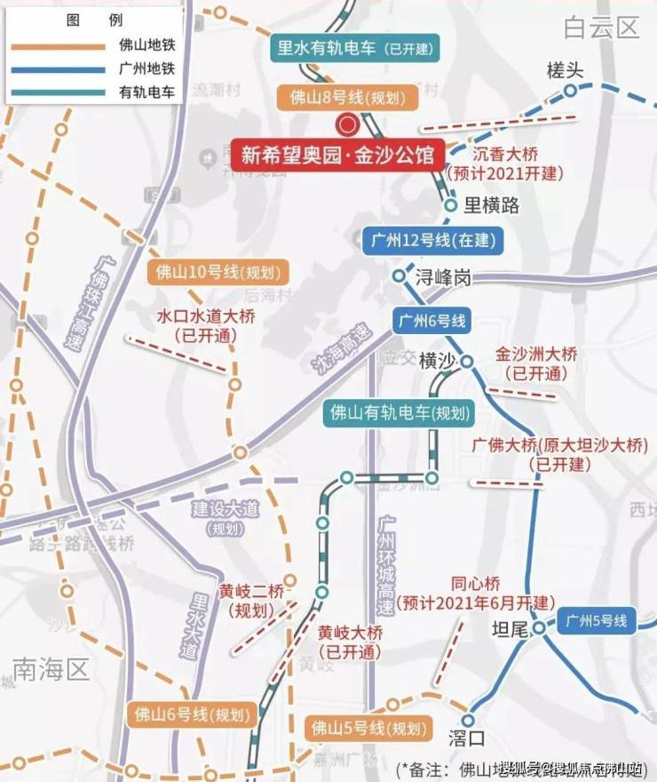 同时,广佛两地边界规划布局了80条衔接道路,未来实现广佛两市中心区30分钟互达,这对于在广佛交界的金沙洲来说坐享利好。其中有轨电车永润广场站(在建中)就在金沙公馆楼下,无缝接驳6号线、12号线(建设中)、佛山8号线(规划中)。