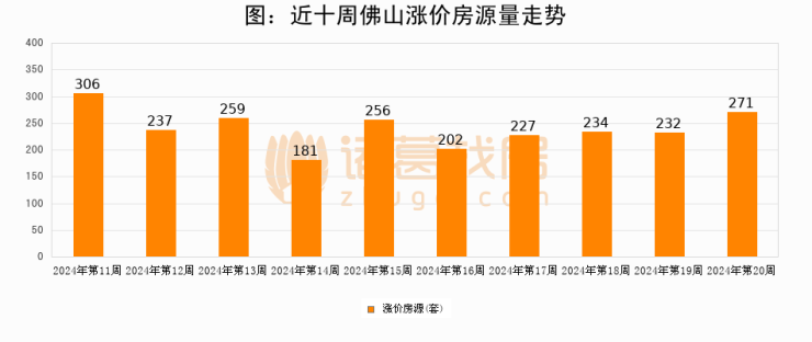 从调价房源来看,第20周佛山涨价房源271套,较上周上涨16.8%。与此同时,20周涨价房源占比回落0.16个百分点,业主信心小幅波动,购房者可则需入市。