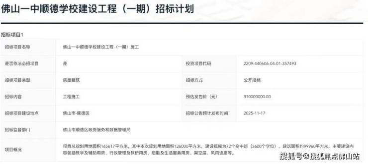 近日,佛山一中顺德学校建设工程(一期)发布招标计划,将于11月17日启动施工招标,预计发包价3.1亿。