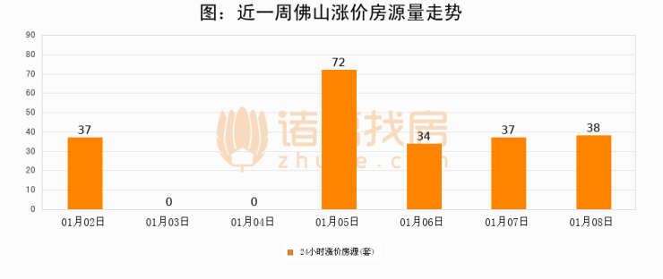 根据诸葛找房数据显示,佛山24小时涨价房源量为38套,较01月07日增加1套,环比上涨2.7%。与此同时,涨价房源占比小幅扩大,业主信心有所提升。