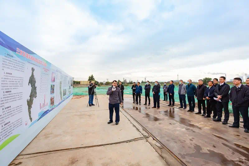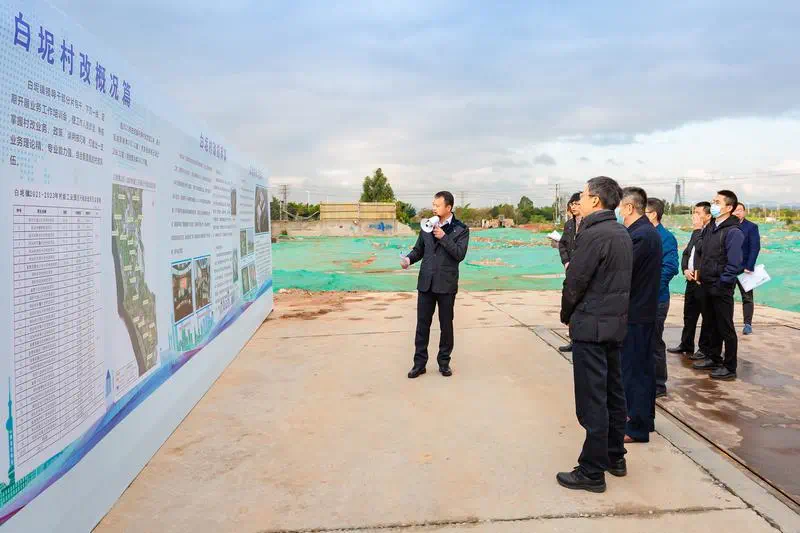 三水开展2021年度村改工作现场视察,现场白坭镇镇长喻晓坤正在介绍该项目的招商引资情况。